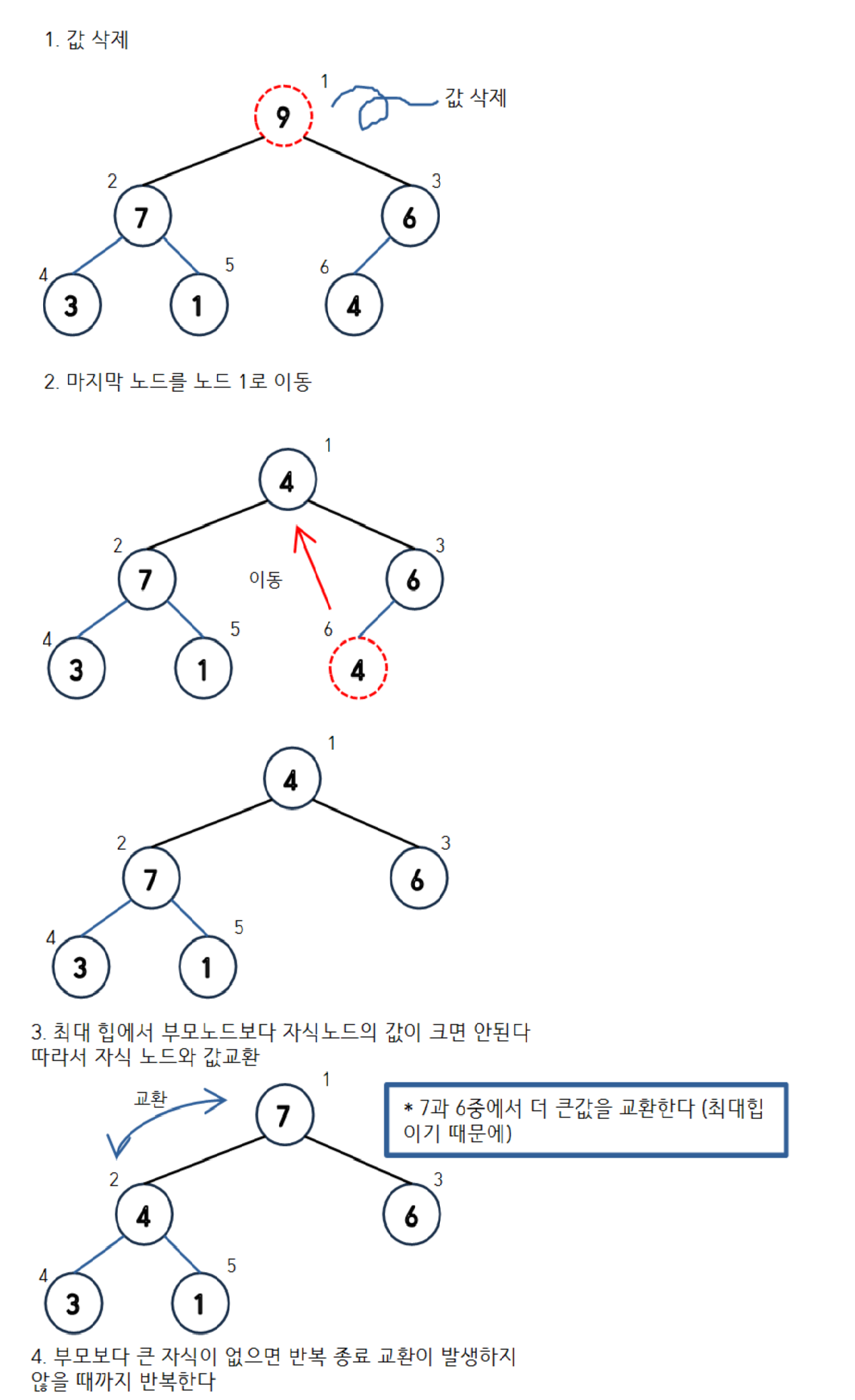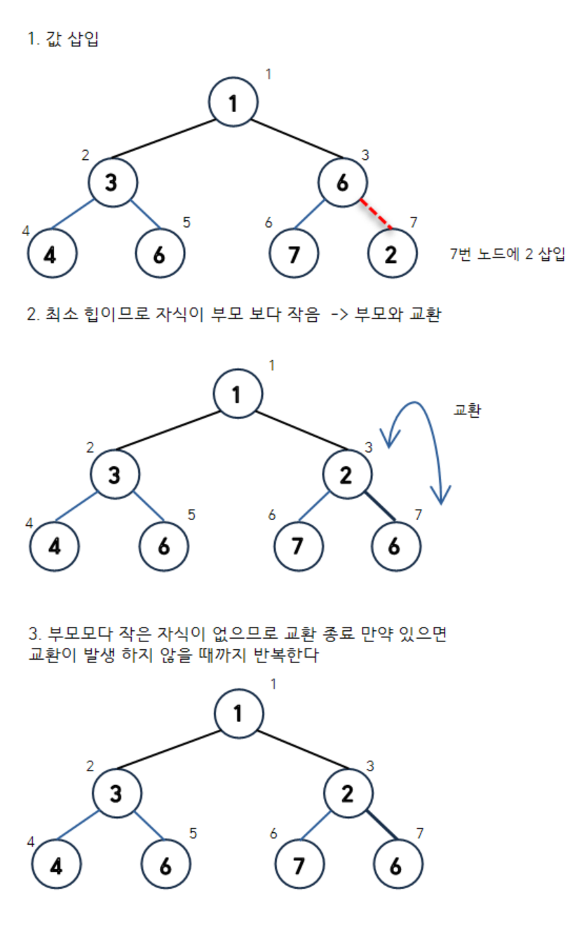- 새 노드를 두고나서 부모노드와 교환한다