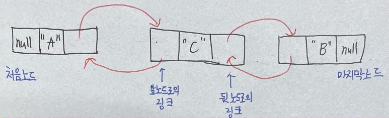 - 한 링크는 다음 노드를 가리키고 다른 한 링크는 앞 노드를 가리킨다