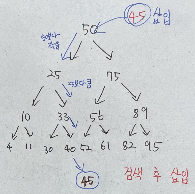 삽입은 검색 + 1단계이다 따라서 O(log N)이 된다