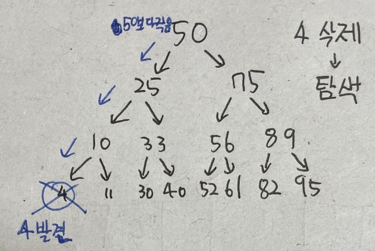 3 찾고 있는 값이 현재 노드보다 작으면 왼쪽 하위 트리 검색