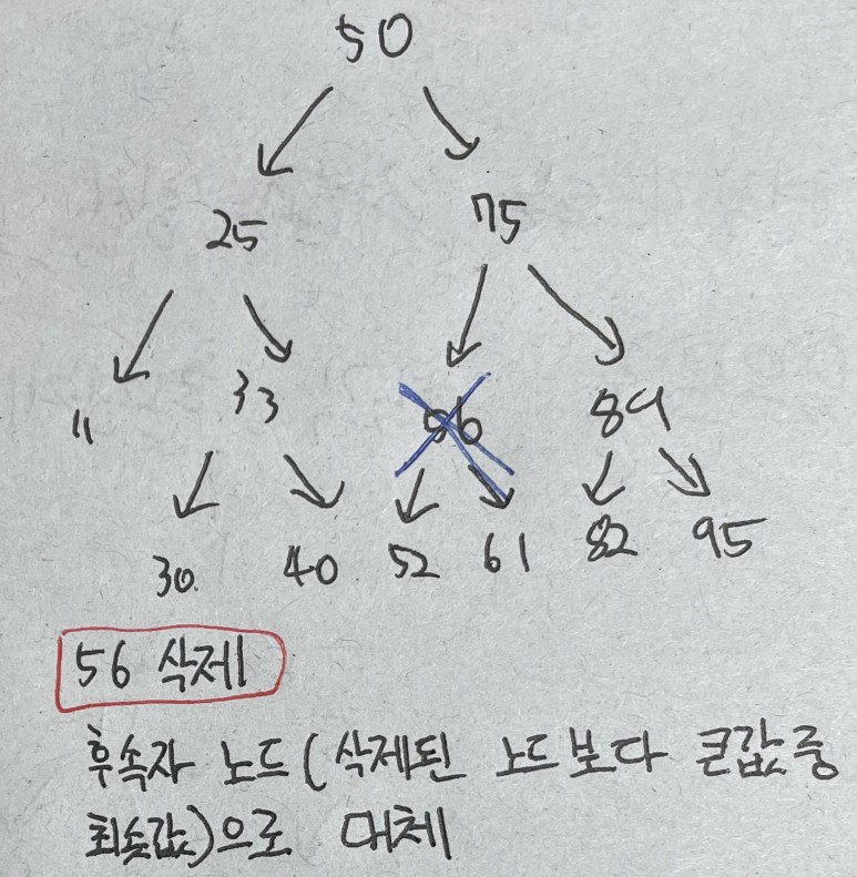 - 자식이 둘인 노드를 삭제할 때는 삭제된 노드를 후속자 노드롤 대체한다