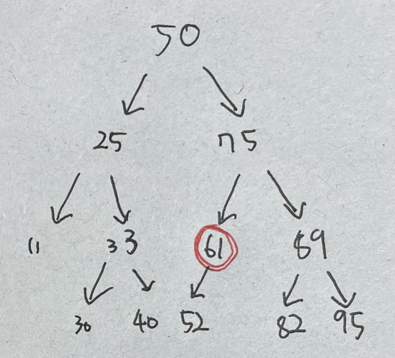 루트 노드를 삭제하면 후속자 노드를 찾아야한다 위에서 52라는 후속자 노드를 찾아 루트 노드에 넣으면 오른쪽 사진 처럼 이진 트리가 배치된다