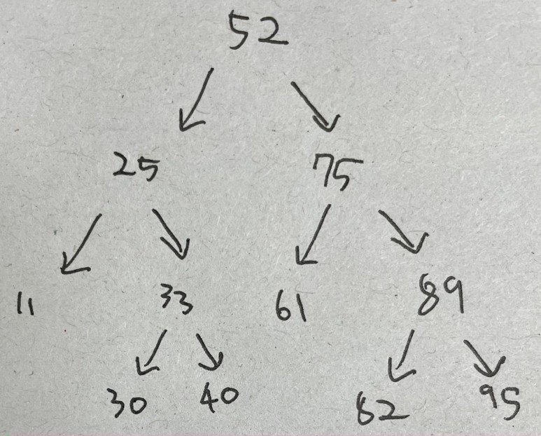 - 한 노드에 자식이 둘이면 한 자식은 부모보다 작은 값을, 다른 자식은 부모보다 큰 값을 가져야 한다