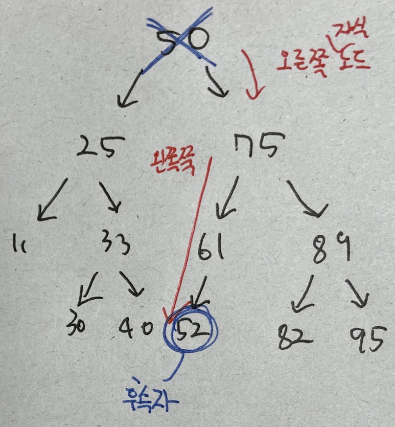 ㄴ 후속자 노드에 오른쪽 자식이 있으면 후속자 노드의 원래 자리에 넣는다