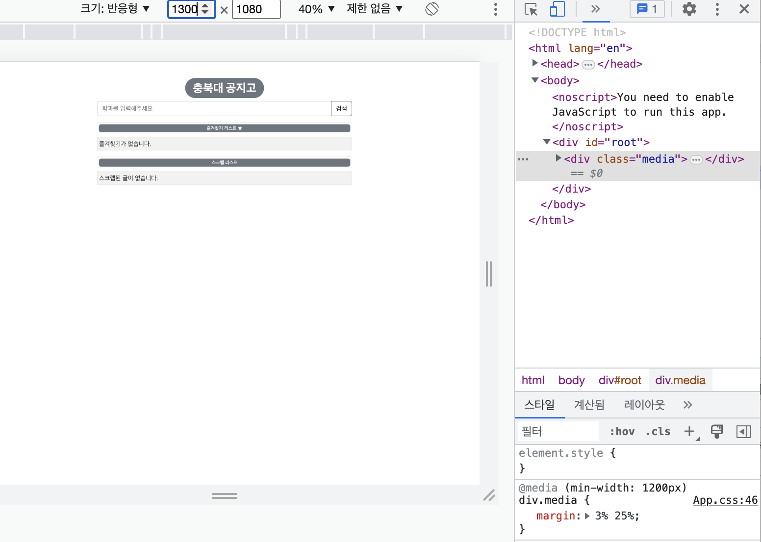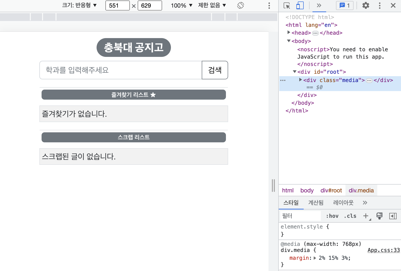공지고 프로젝트는 모바일에서도 공지를 편하게 볼 수 있게할려고 시작한 프로젝트이다 따라서 화면에 맞추어 컴포넌트들이 잘 보여질 수 있도록 해야된다 컴포넌트들은 보톤 bootstrap react로 사용했기 때문에 전체 화면 크기를 맞추는데 사용했다