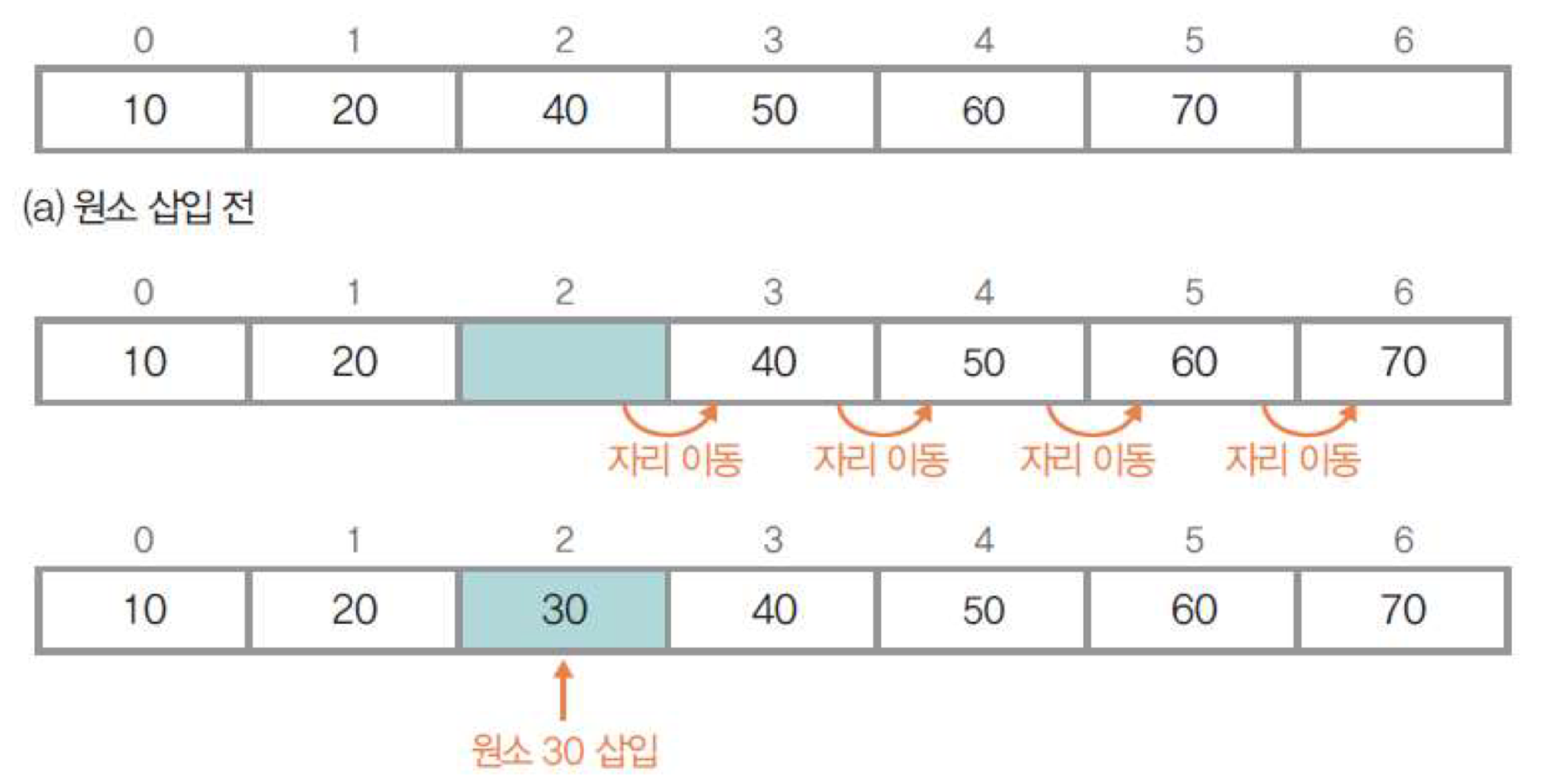 삽입: 선형 리스트에서 k번째 원소를 삽입하는 경우 k번 원소부터 마지막 인덱스 n번 원소까지 (n-k+1)개의 원소 이동