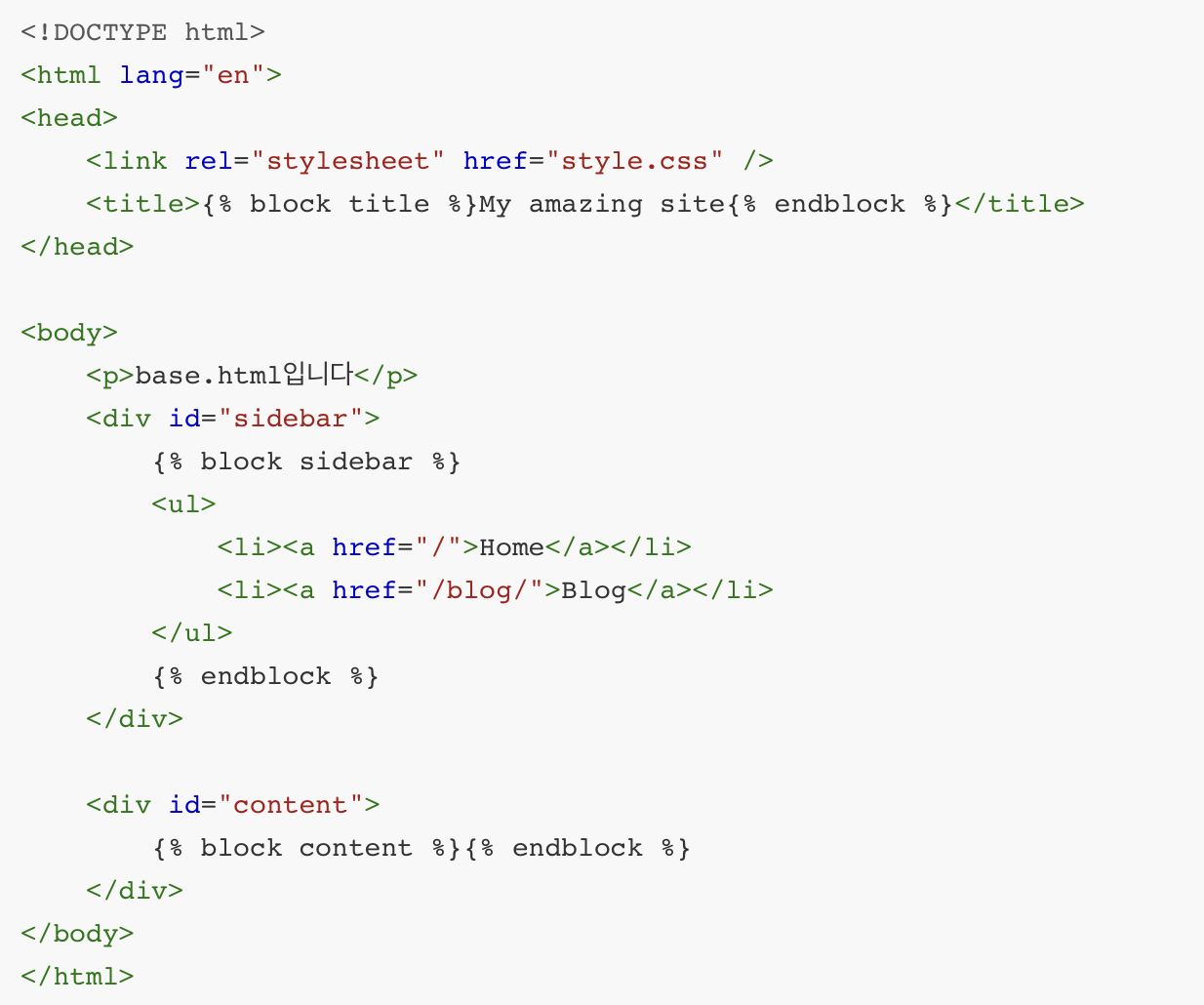 상속을 하는데 필요한 태그는 block과 extend이다 이 내부에 들어갈 html 코드를 확장한 다른 html에서 덮어쓸 수 있다는 것을 알려준다