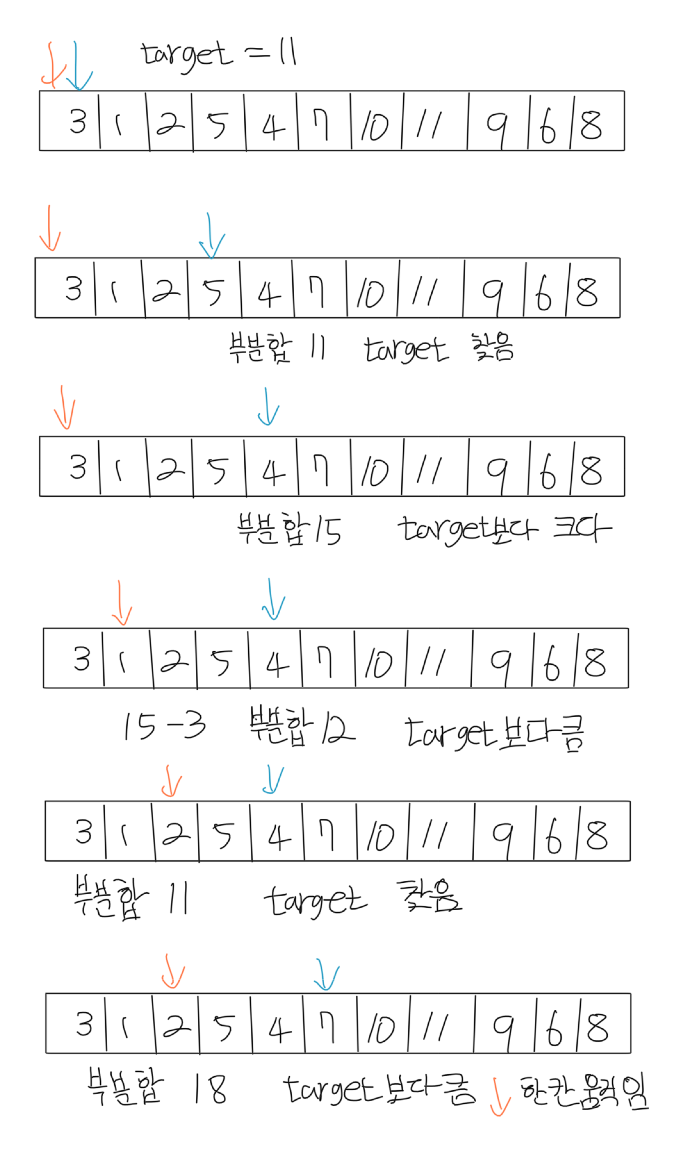 - 부분합이 target 보다 크면 start(주황)을 한칸 이동시키고 부분합에서 포인터가 이동하기 전 값을 뺀다