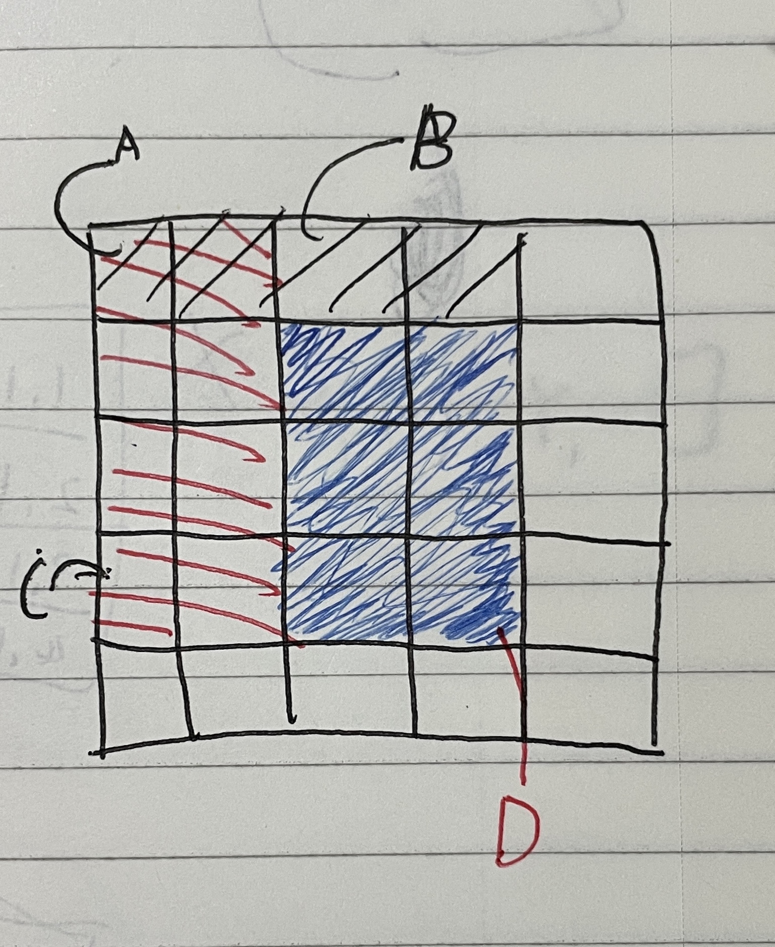 위 사진에서 우리가 원하는 구간 파란색의 부분합을 구하기위해서는 D까지의 부분합 D -C-D+A(두번 뺐으므로 한번 더 해준다) 가 된다