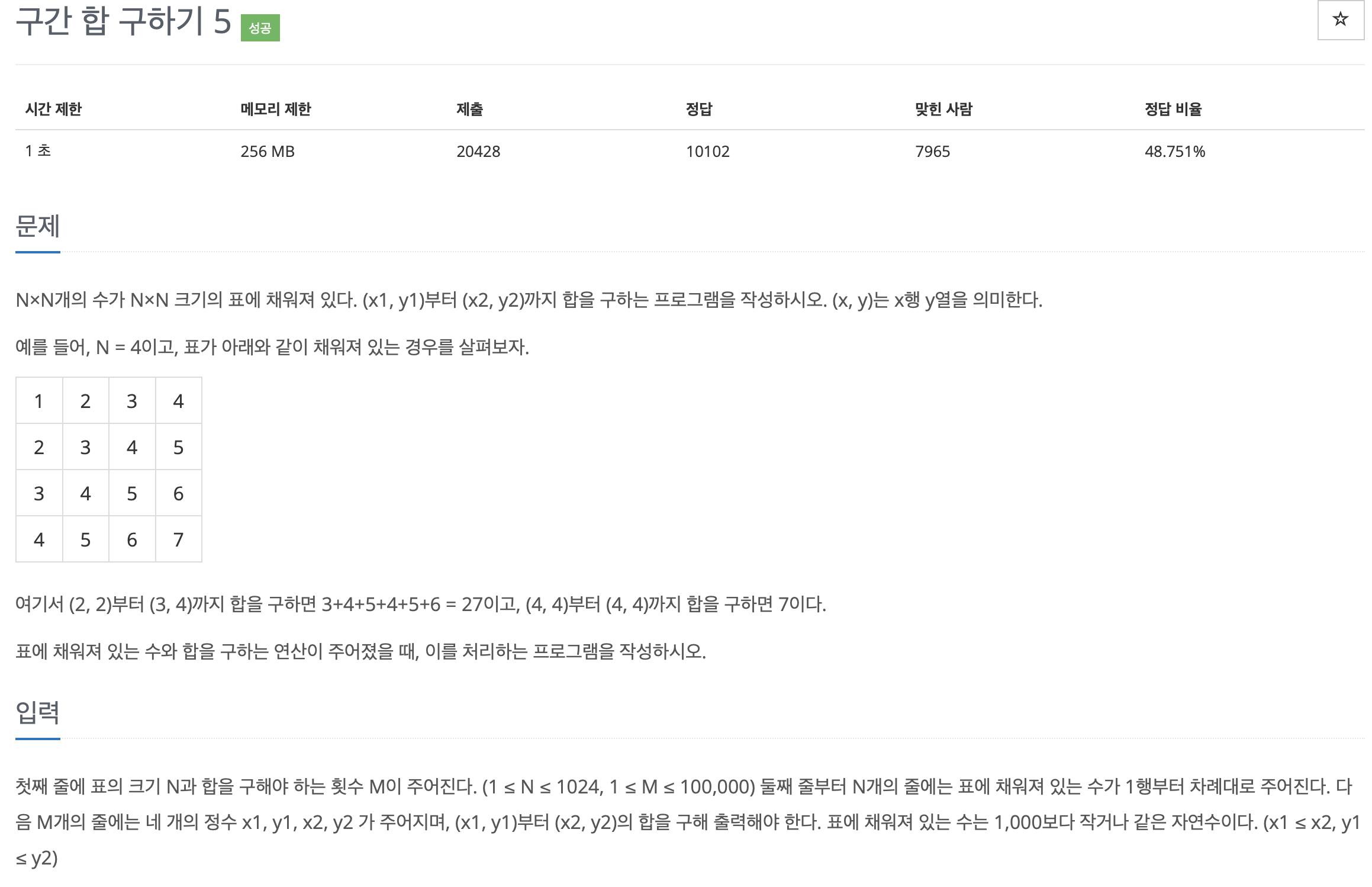 이번 문제는 부분합을 이용하는것이지만 한개의 리스트로 이루어진 것이 아니라 이중리스트 2차원 배열을 이용한는것이다 따라서 부분합을 구할때 처음부터 차례대로 부분합을 구하는 방법을 사용하면 이문제를 해결하기 어렵다
