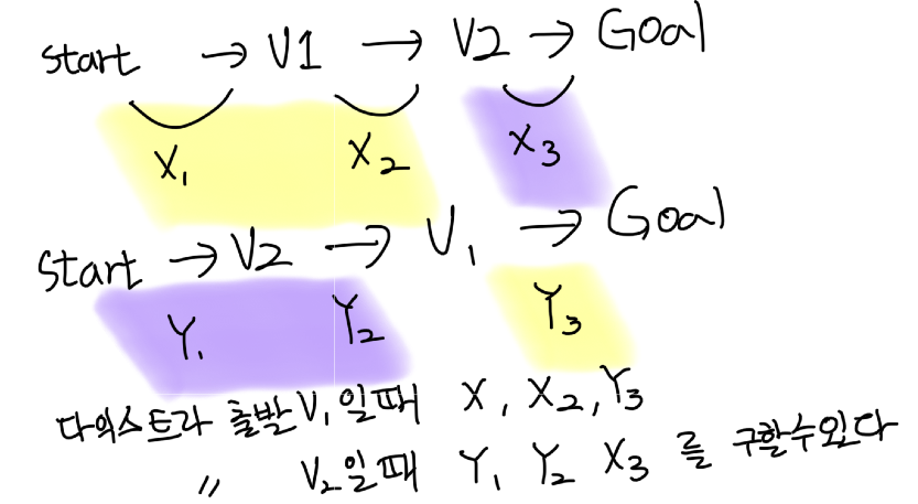 (1) start -> v1 -> v2 -> goal 또는 (2) start -> v2 -> v1 -> goal 이렇게 2가지 경우만 존재한다 두가지 경우으 값을 비교해서 최단거리를 출력한다