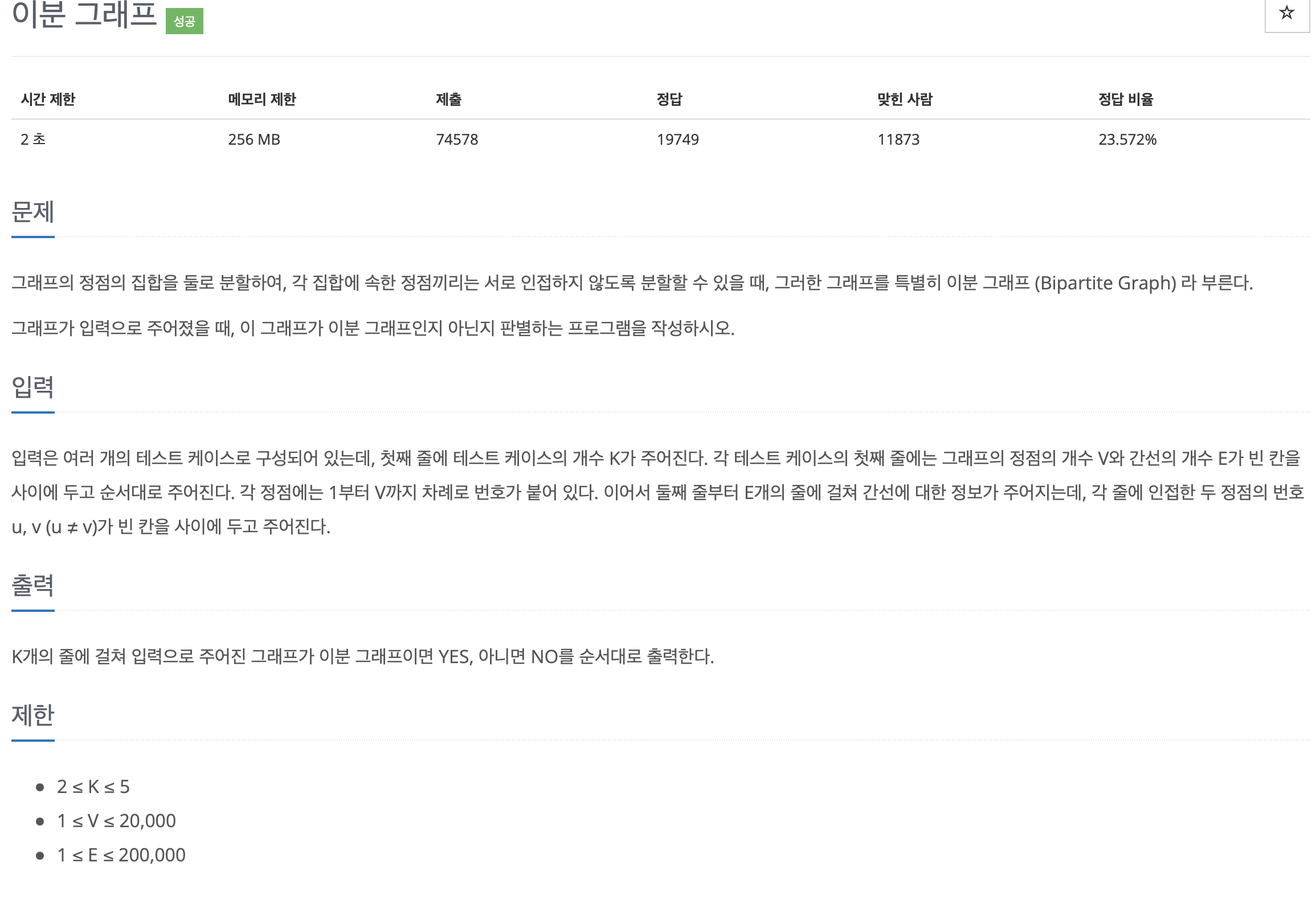 이분 그래프 판단 방법으로 대표적 2개가 있다 dfs와 bfs를 통해서 해결할 수 있는데 bfs를 이용해서 같은 위치(같은 최단거리)일때 서로 연결 되어있으면 안된다라고 생각 하고 풀었다 하지만 같은 위치의 정점을 또 모두 if문을 돌리기에는 시간 초과가 날것 같았다