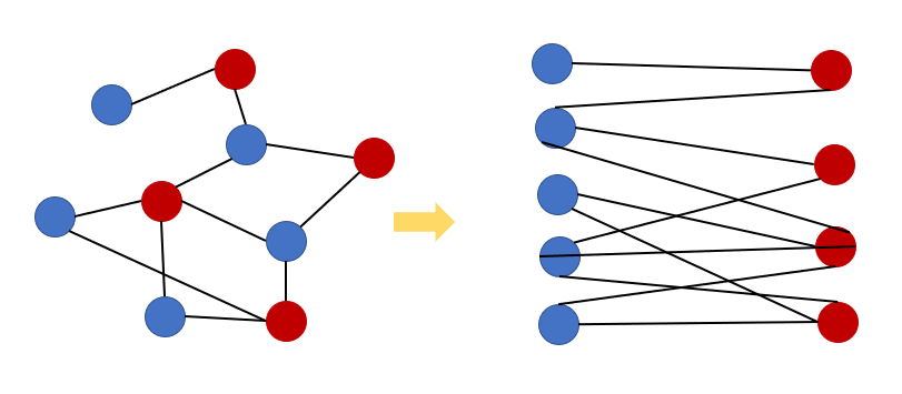 위 그림과 같이 파란색끼리는 연결이 안되고 빨간색끼리도 연결이 안되지만 서로 연결되어 있는 그래프를 이분 그래프라고 한다