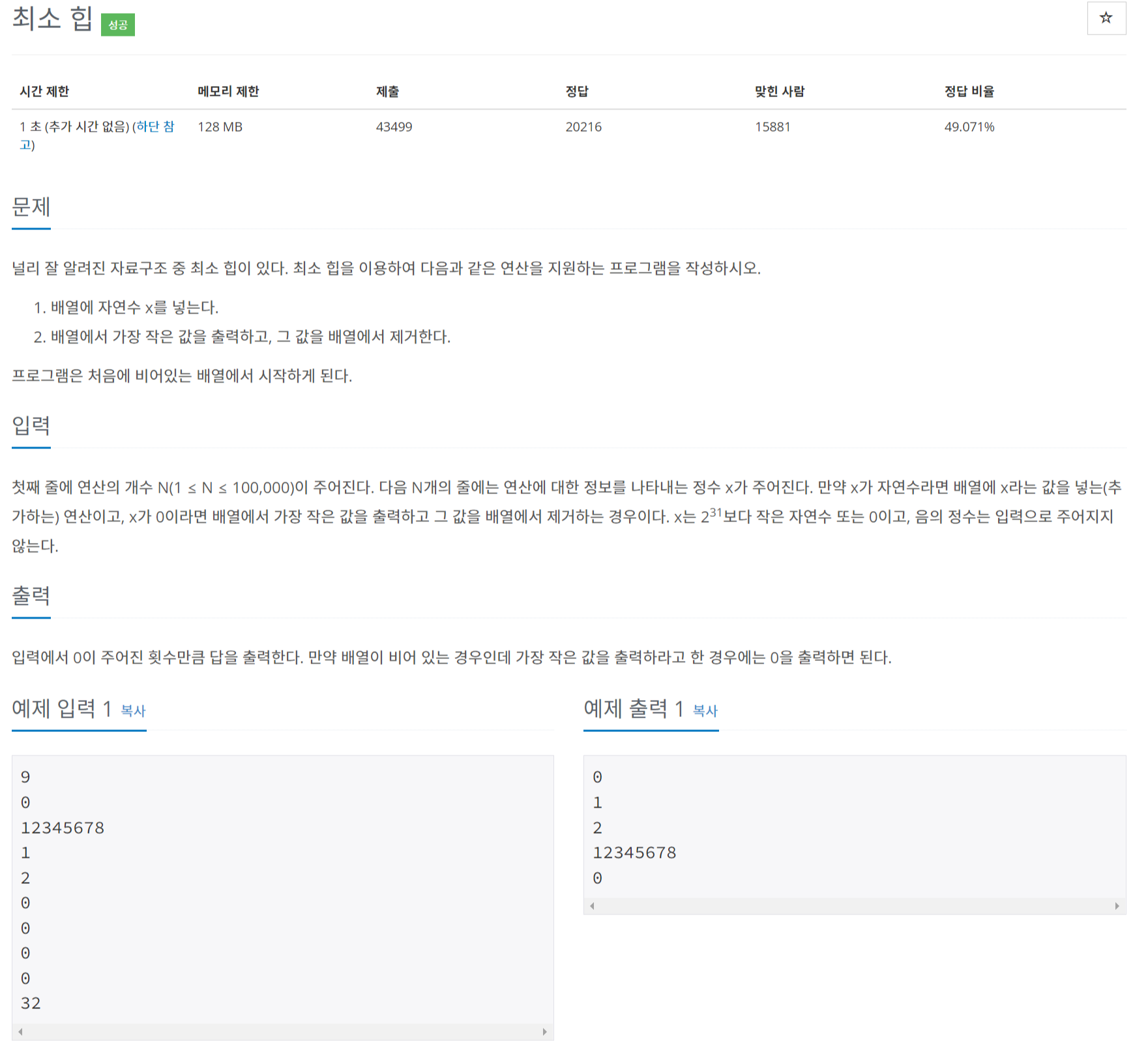 최소 힙 문제로 이전 문제 최대 힙과 같은 문제이다 최대 힙을 구현할때는 음수로 지정해서 힙에 넣었지만 이번에는 그냥 넣으면 최소 힙이 바로된다