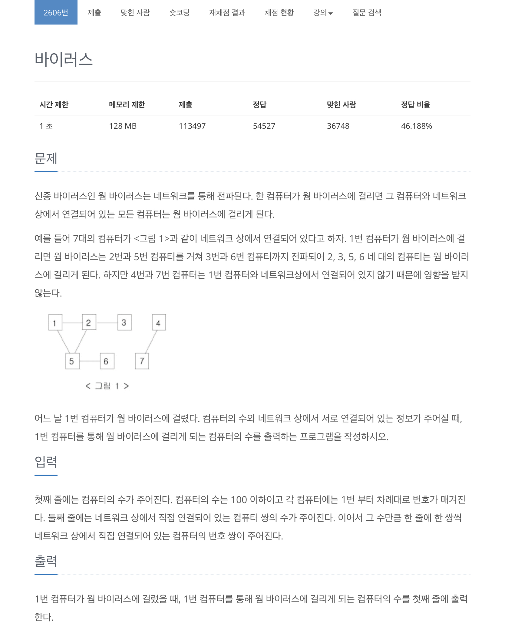 DFS,BFS를 이용한 문제 풀이 바이러스에 감염된 컴퓨터에 연결된 컴퓨터를 모두 찾아서 그 숫자를 세면된다 DFS나 BFS중 가중치를 1로 계산해서 마지막 가중치에서 처음 감염된 컴퓨터를 빼줌 (-1) 그러면 감염된 컴퓨터의 총 개수가 나온다