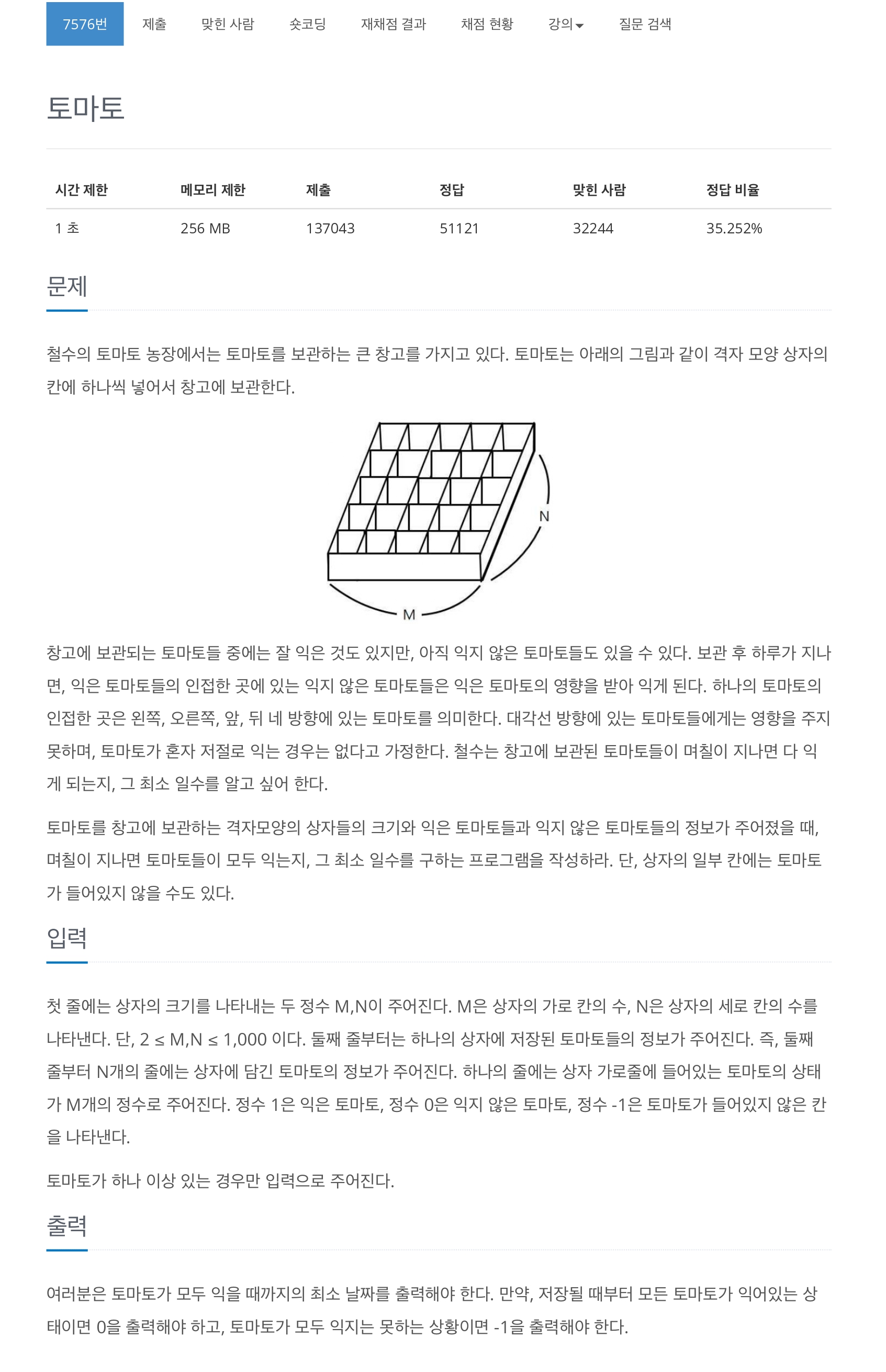 입력에서 1이 여러개가 있으면 동시다발적으로 bfs가 실행되야 결과가 잘 나올 것이다 다른 문제에서는 한점으로 시작했지만 주어진 입력에 따라서 1이 여러개라면 하나씩 bfs를 돌리면 우리가 원하는 결과가 나오지 않는다 한번 bfs가 돌리고 끝날것임 그래서 처음 시작할 때 큐에 1이 있는 좌표를 모두 넣고 시작해서 번가라 가면서 bfs가 실행된다