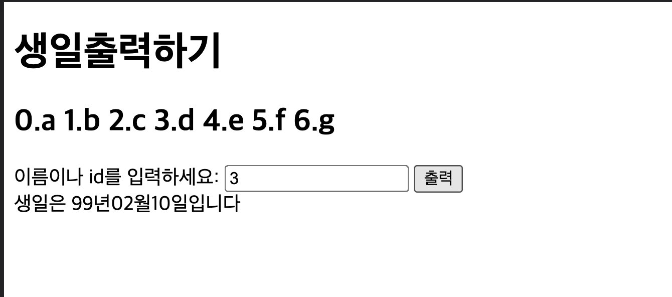 - 인덱스 번호를 입력하여 서버로 부터 생일 데이터를 요청하여 그에 맞는 생일을 출력한다