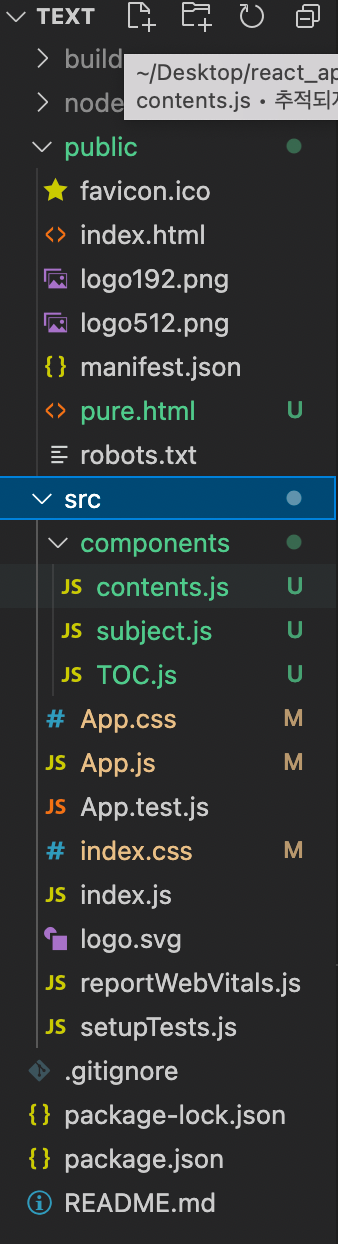 구조가 사진과는 똑같지는 않지만 public과 src가 생겼을것이다 컴포넌트들 보통 src에 저장하는데 컴포넌트를 모아서 보기위해 components 폴더를 만들어 그 안에 컴포넌트.js를 저장했다