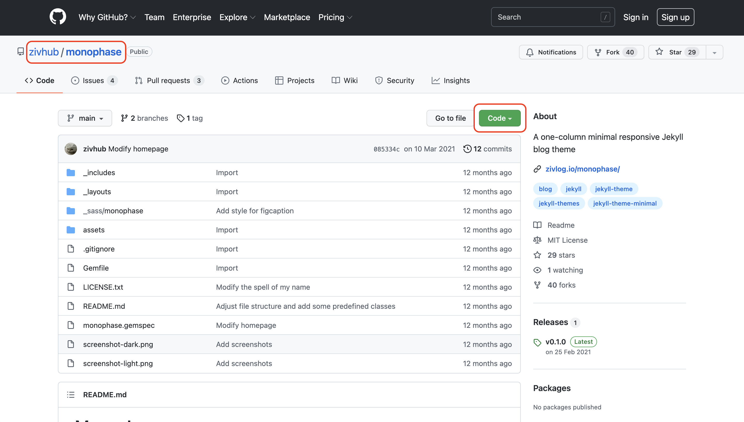 자기가 정한 테마의 github로 들어가서 코드를 다운 받는다 코드 버튼 클릭후
