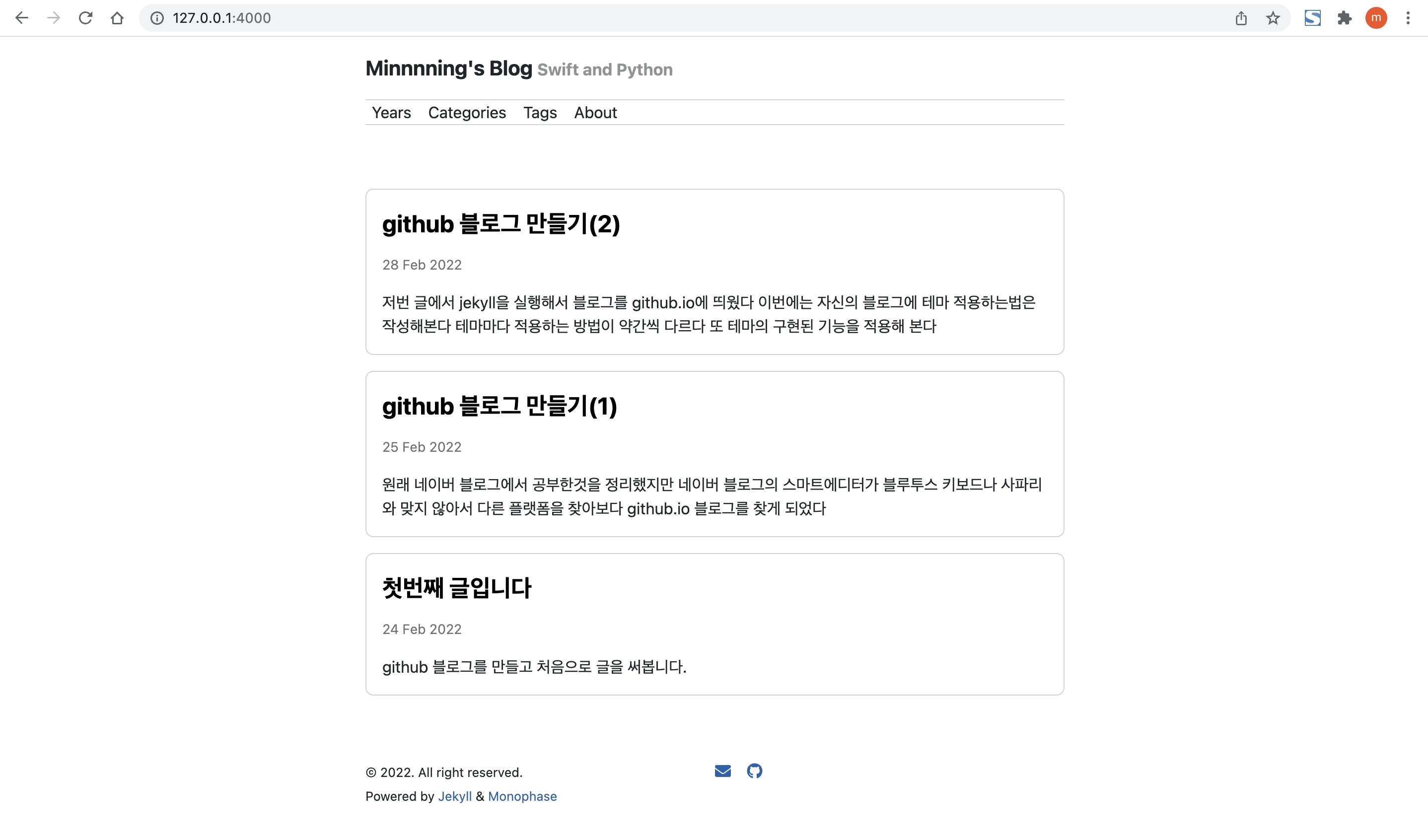 bundle exec jekyll sever를 통해서 로컬 서버를 실행시킨다