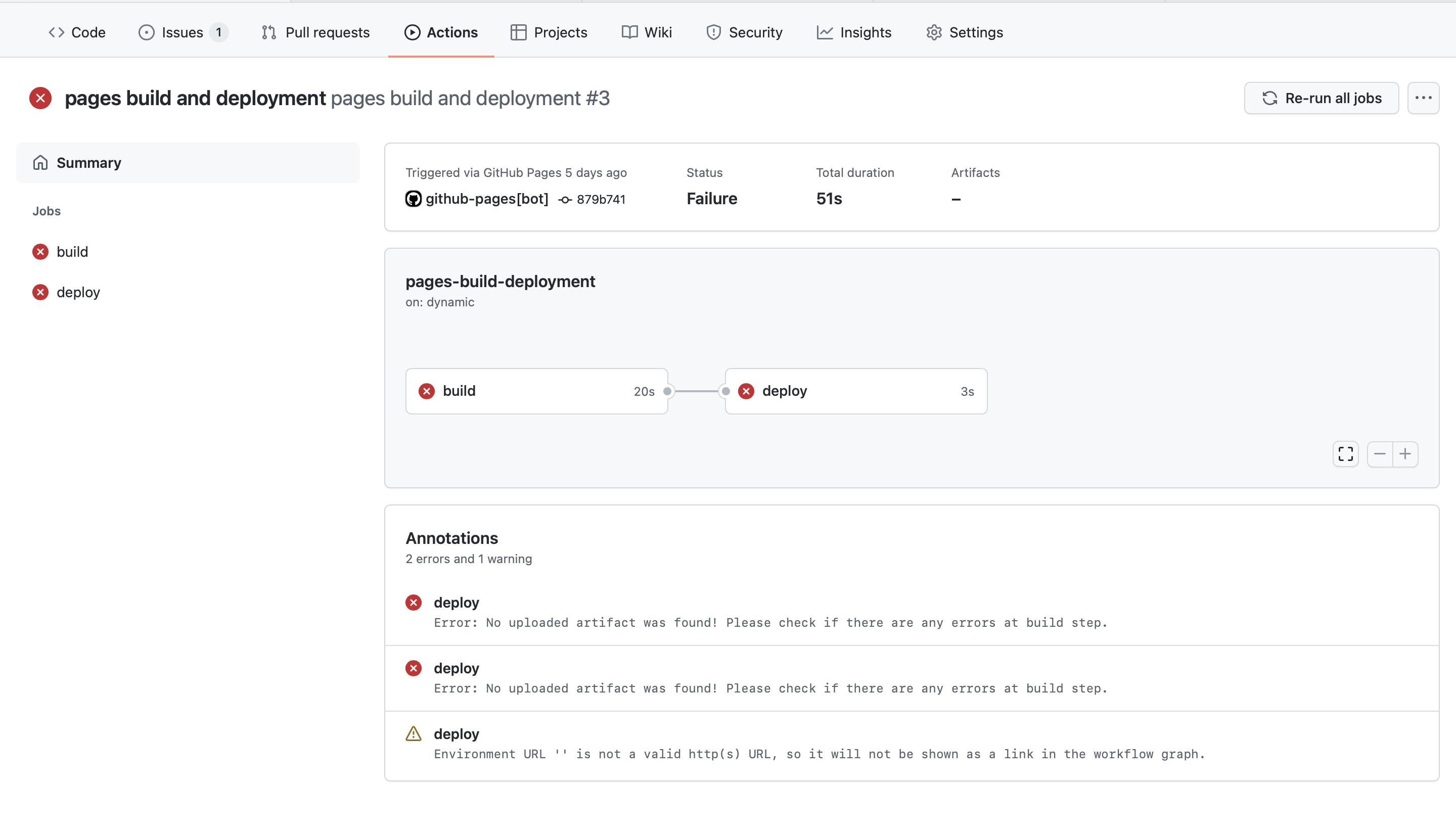 내 레포의 action을 보니 github.io에 내 페이지를 올리는 과정에서 에러가 난것 같았다(push는 정상적으로 이루어짐)