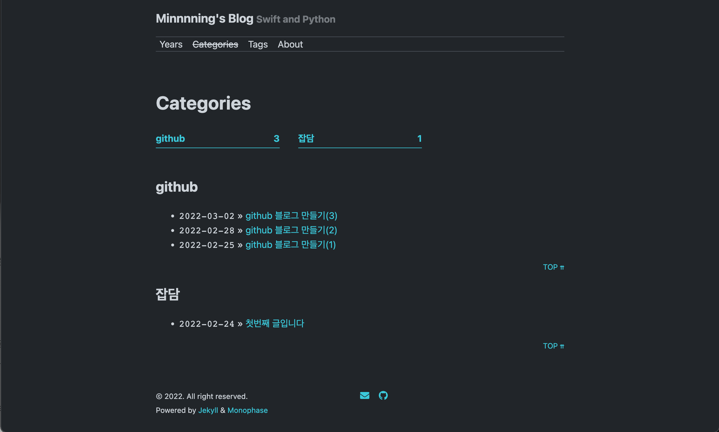 소셜 버튼은 화면 맨 아래 2개의 버튼이 있는데 메일과 깃허브 페이지 버튼이 있다 트위터도 추가 할 수 있지만 트위터가 없어서 위 2개만 추가 했다