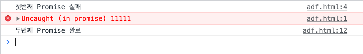 실행부 코드를 보면 promise()를 호출하면 Promise객체가 리턴된다 정상적으로 비동기 작업이 완료 되었다면 호출하는 then이 있고 에러가 발생하면 (reject가 실행) catch로 에러를 처리할 수 있다