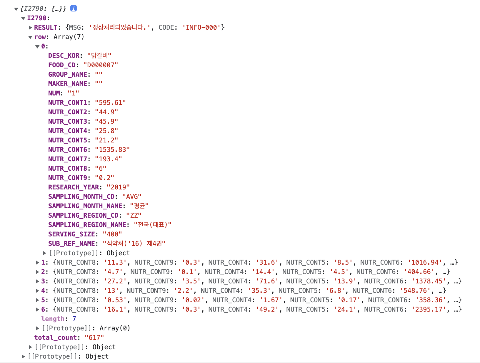 식품정보 API 이용예시 여기서 해당 값이 뭘 의미하는지 알 수 있다