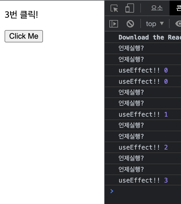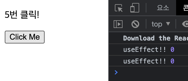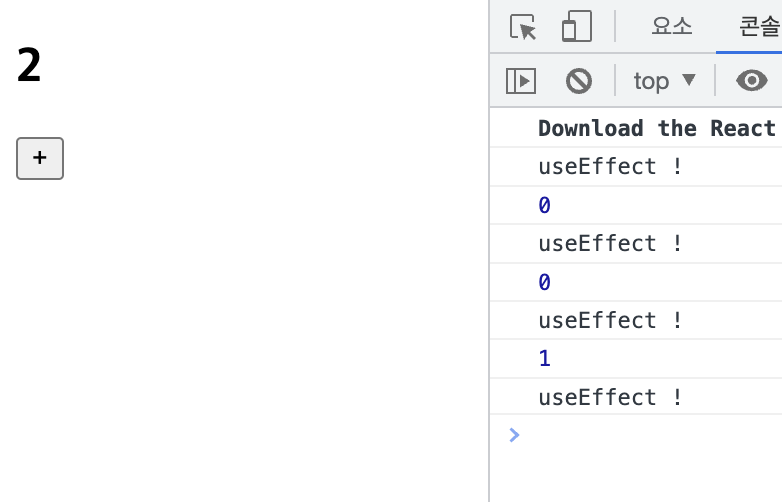 렌더링이 완료될 때 마다 useEffect 실행된다 console.log("useEffect!!", count)를 그냥 해당 위치에 작성한는것과 같은 결과지만 이건 렌더링 이후 실행된다