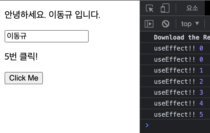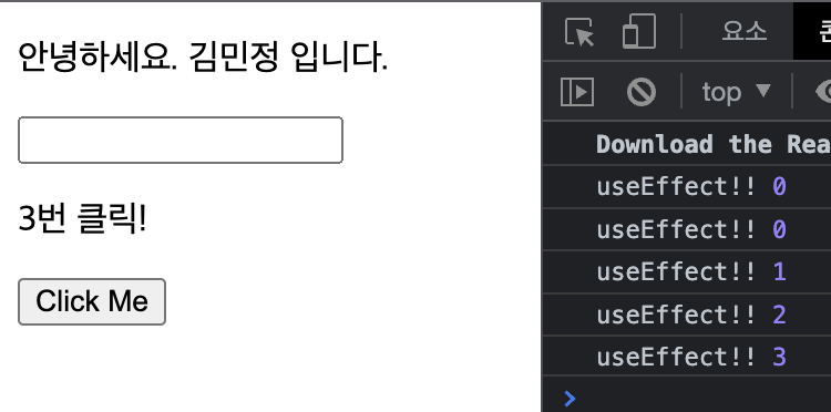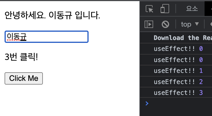 특정 값이 변경 되었을 때만 재렌더링 된다 여기서는 name은 변경되어도 useEffect가 실행되지 않지만 count가 변경되면 console.log("useEffect!!", count) 가 실행된다
